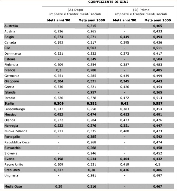 I dati Ocse(2) evidenziano come l’aumento della disuguaglianza nelle varie nazioni sia andato di pari passo con l’applicazione della ricetta neoliberista. “Il coefficiente di Gini, una misura standard di disuguaglianza di reddito che va da zero (quando tutti hanno redditi identici) a uno (quando tutto il reddito va a una sola persona), era pari a una media di 0,29 nei Paesi Ocse a metà degli anni Ottanta. Alla metà degli anni Duemila era aumentato di quasi il 10%, arrivando a quota 0,316. [...] Nel corso del tempo, la disuguaglianza di reddito ha seguito diversi schemi nei vari Paesi dell’Ocse: per prima è iniziata ad aumentare alla fine degli anni Settanta e inizio anni Ottanta in alcuni Paesi di lingua inglese, in particolare il Regno Unito e gli Stati Uniti, ma anche Israele. Dalla fine degli anni Ottanta, l’aumento delle disparità di reddito è diventato più diffuso. Le ultime tendenze degli anni Duemila hanno mostrato un divario crescente tra ricchi e poveri non solo nei Paesi che già mostravano una forte disuguaglianza, come Israele e Stati Uniti, ma anche – per la prima volta – in Paesi tradizionalmente a bassa disuguaglianza, come Germania, Danimarca e Svezia (e altri Paesi nordici), dove negli anni Duemila la disuguaglianza è cresciuta più che altrove” (vedi tabella 1, colonna A).